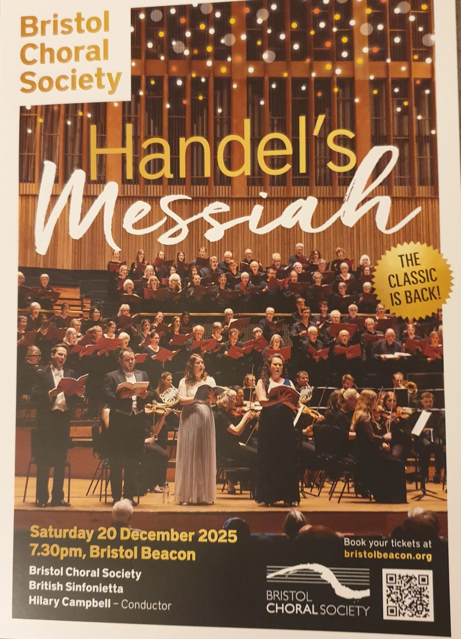 A great way to start your Christmas celebrations - come and hear Handel's Messiah with a large choir (Bristol Choral Society) and orchestra (British Sinfonietta) at Bristol Beacon on Saturday 20 December at 7.30 pm: https://www.bristolchoral.co.uk/Messiah